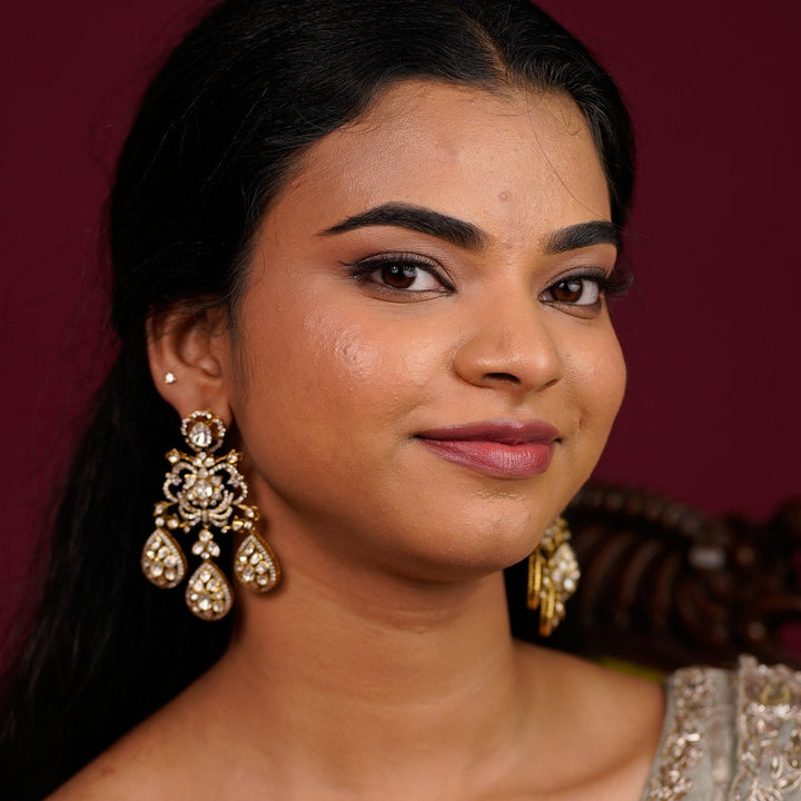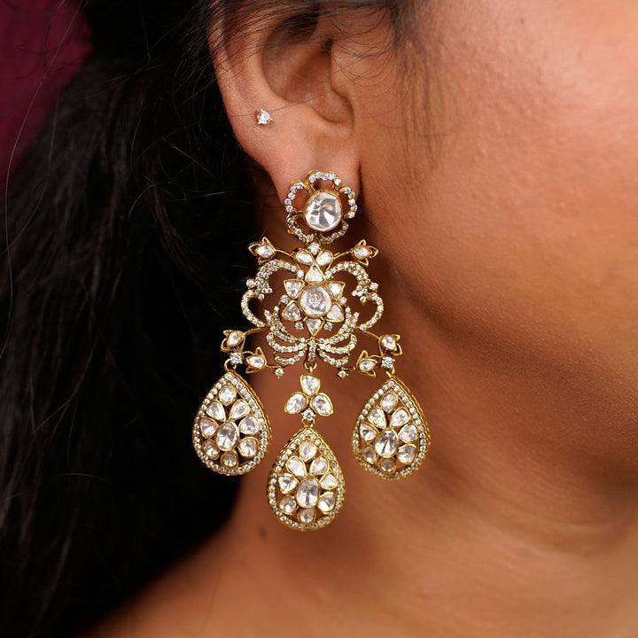 Embrace regal elegance with the Mehrangarh Polki Chandeliers, a statement piece that blends traditional Indian artistry with sophisticated design. These majestic chandelier earrings are meticulously crafted from high-quality 92.5 Sterling...