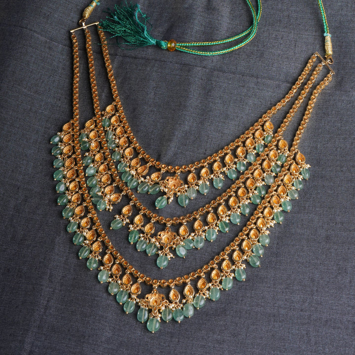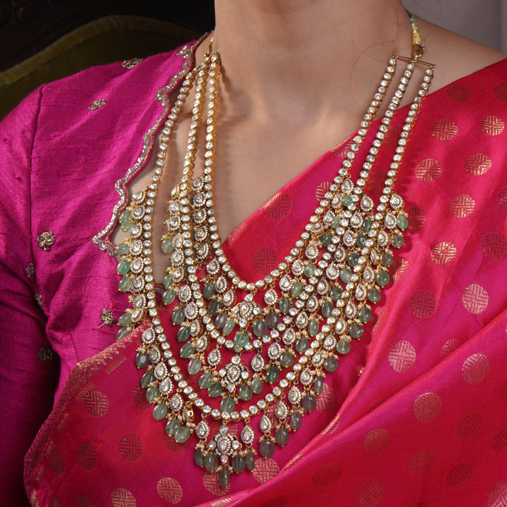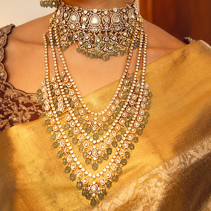 Step into timeless splendor with our Victorian Emerald Cascade Haram, an exquisite layering of antique charm and regal brilliance. Adorned with dazzling polki stones, delicate emerald drops, and intricate Victorian-style...