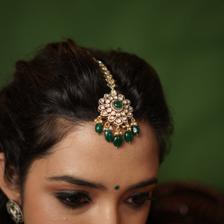 Elevate your bridal attire with our Nobility Maangtika. Featuring a captivating emerald stone framed by shimmering zircon stones, this exquisite piece blends classic beauty with contemporary charm, making it ideal...