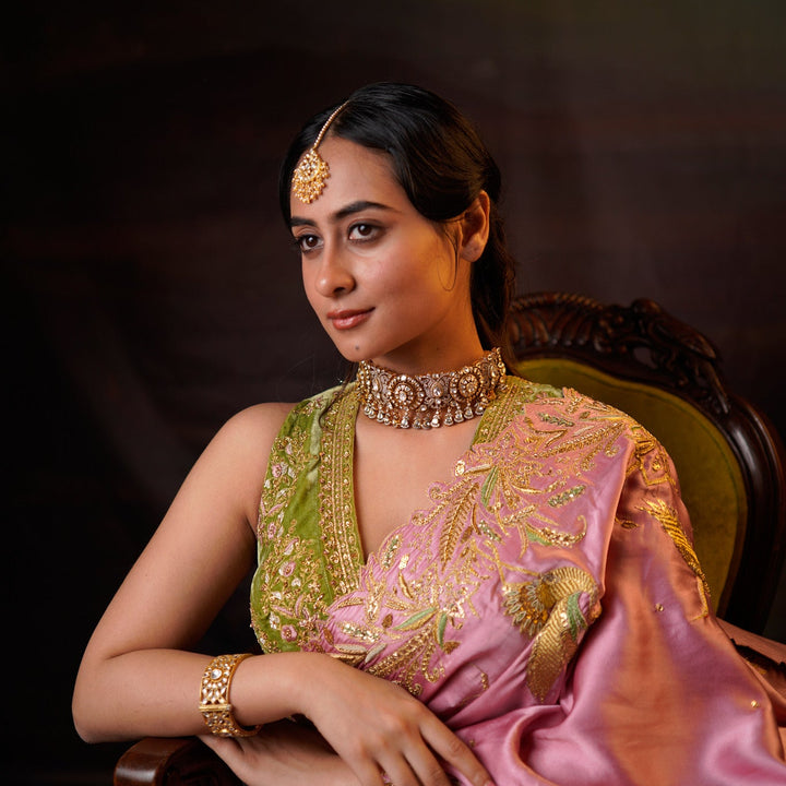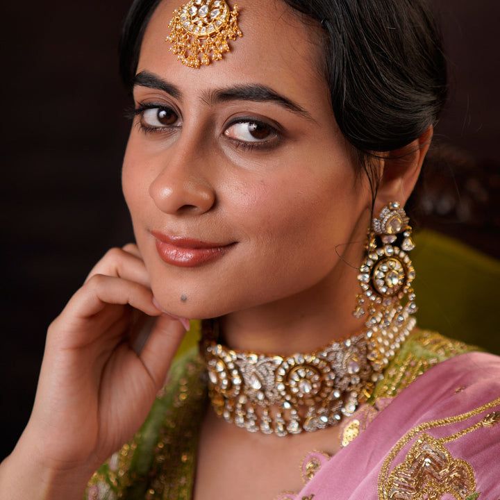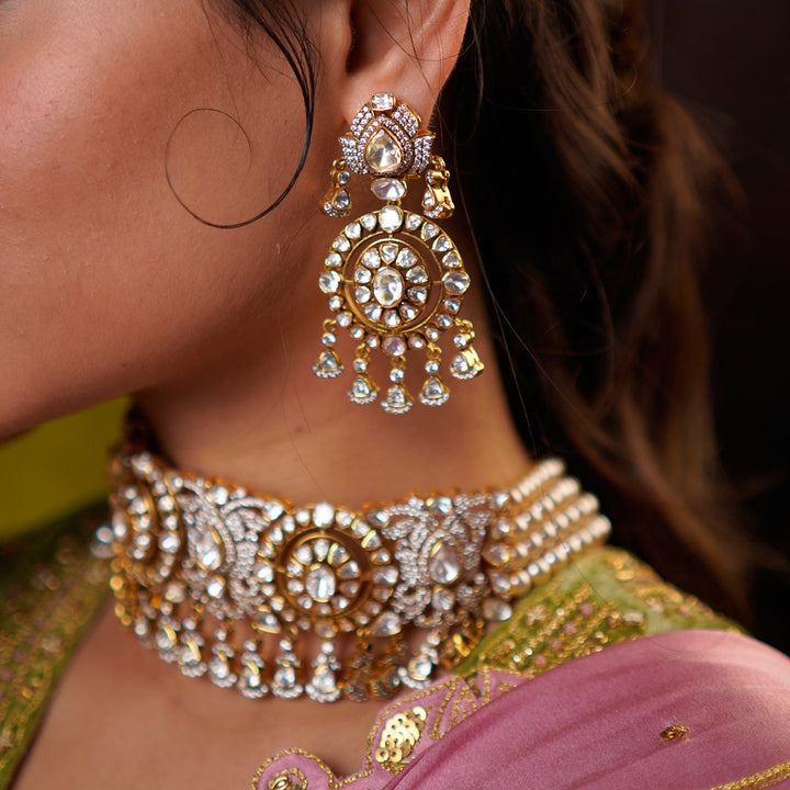 Command attention with this magnificent Heirloom-Quality Polki Choker. Crafted from premium 92.5 Sterling Silver and finished with a rich 22-carat antique gold polish, this choker exudes regal charm. The intricate...