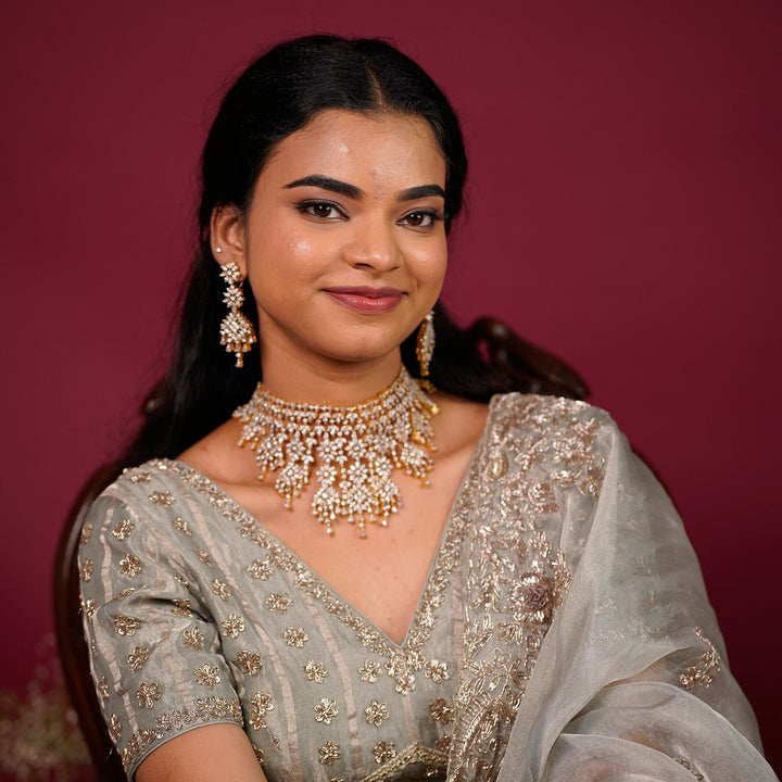 Make a spectacular entrance with this Grand Zircon Choker Necklace and Earring Set. Crafted meticulously in genuine 92.5 Sterling Silver, this set features the sought-after Ganga Jamuna Polish—a luxurious dual-tone...
